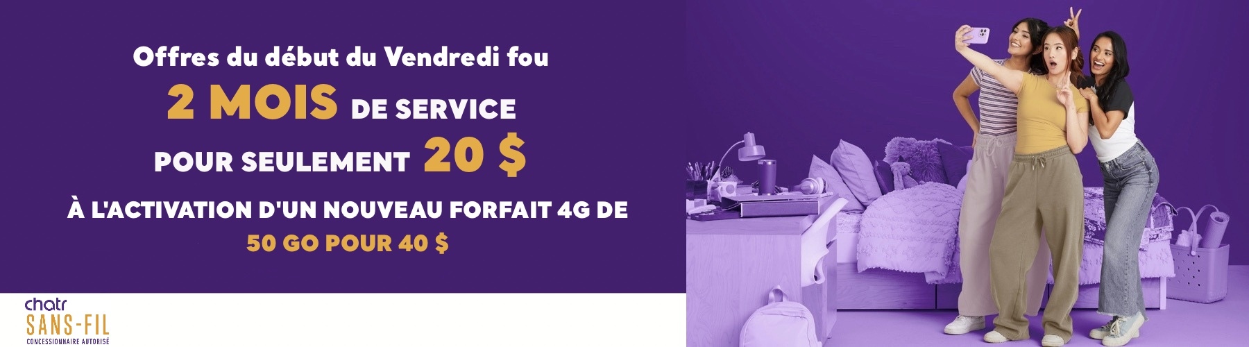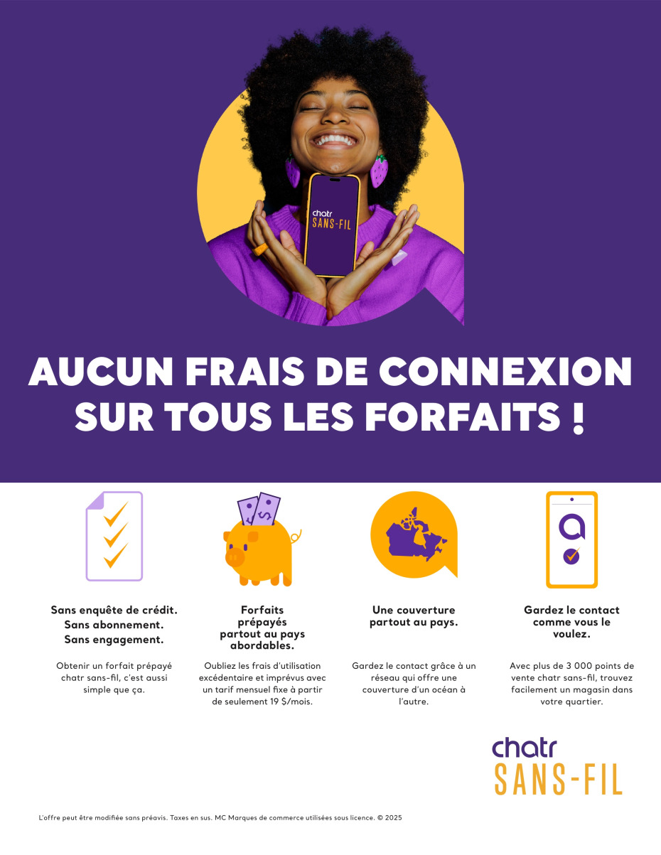 AVIS : Des frais uniques de 10 $ pour l’activation s’appliquent maintenant lors de l’activation d’un nouveau service chatr. Ces frais ne s’appliquent pas si vous choisissez un forfait de 39 $ ou plus en Ontario, ou de 40 $ ou plus au Québec.