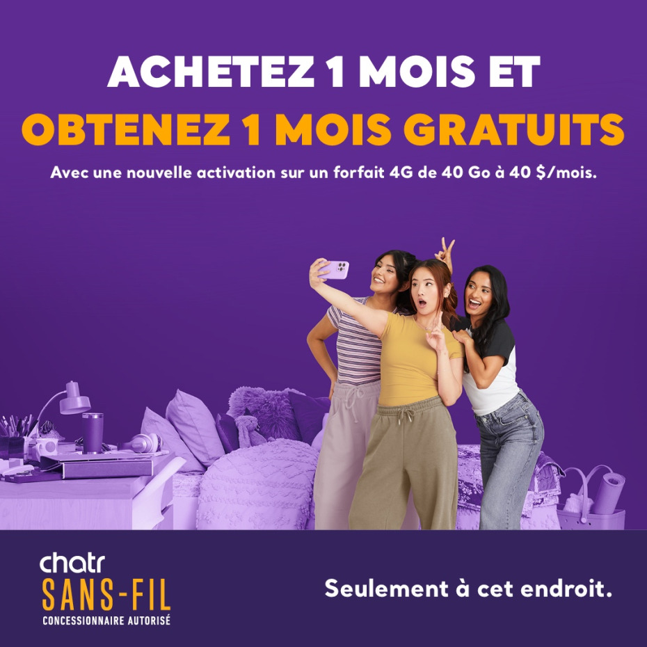 L’offre est sujette à modification sans préavis. Cette offre ne peut être combinée avec d’autres offres. Le bonus de données expirera si le compte devient inactif ou si le forfait est modifié avant la fin de la période promotionnelle.